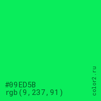 Цвет #09ED5B в цветовой модели RGB обозначается тремя октетами (9, 237, 91) в десятичном формате и #09ED5B в шестнадцатиричном (hex) формате, которые являются интенсивностью красного 9 (hex 09), интенсивность зелёного 237 (hex ED) и интенсивность синего 91 (hex 5B).
