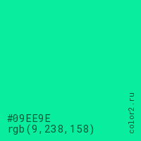 Цвет #09EE9E в цветовой модели RGB обозначается тремя октетами (9, 238, 158) в десятичном формате и #09EE9E в шестнадцатиричном (hex) формате, которые являются интенсивностью красного 9 (hex 09), интенсивность зелёного 238 (hex EE) и интенсивность синего 158 (hex 9E).