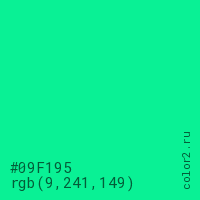 Цвет #09F195 в цветовой модели RGB обозначается тремя октетами (9, 241, 149) в десятичном формате и #09F195 в шестнадцатиричном (hex) формате, которые являются интенсивностью красного 9 (hex 09), интенсивность зелёного 241 (hex F1) и интенсивность синего 149 (hex 95).