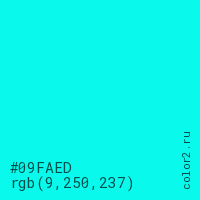 Цвет #09FAED в цветовой модели RGB обозначается тремя октетами (9, 250, 237) в десятичном формате и #09FAED в шестнадцатиричном (hex) формате, которые являются интенсивностью красного 9 (hex 09), интенсивность зелёного 250 (hex FA) и интенсивность синего 237 (hex ED).