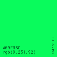 Цвет #09FB5C в цветовой модели RGB обозначается тремя октетами (9, 251, 92) в десятичном формате и #09FB5C в шестнадцатиричном (hex) формате, которые являются интенсивностью красного 9 (hex 09), интенсивность зелёного 251 (hex FB) и интенсивность синего 92 (hex 5C).