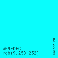 Цвет #09FDFC в цветовой модели RGB обозначается тремя октетами (9, 253, 252) в десятичном формате и #09FDFC в шестнадцатиричном (hex) формате, которые являются интенсивностью красного 9 (hex 09), интенсивность зелёного 253 (hex FD) и интенсивность синего 252 (hex FC).