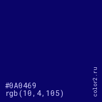Цвет #0A0469 в цветовой модели RGB обозначается тремя октетами (10, 4, 105) в десятичном формате и #0A0469 в шестнадцатиричном (hex) формате, которые являются интенсивностью красного 10 (hex 0A), интенсивность зелёного 4 (hex 04) и интенсивность синего 105 (hex 69).