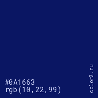 Цвет #0A1663 в цветовой модели RGB обозначается тремя октетами (10, 22, 99) в десятичном формате и #0A1663 в шестнадцатиричном (hex) формате, которые являются интенсивностью красного 10 (hex 0A), интенсивность зелёного 22 (hex 16) и интенсивность синего 99 (hex 63).