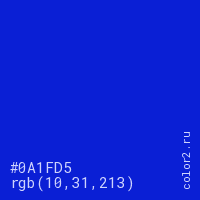 Цвет #0A1FD5 в цветовой модели RGB обозначается тремя октетами (10, 31, 213) в десятичном формате и #0A1FD5 в шестнадцатиричном (hex) формате, которые являются интенсивностью красного 10 (hex 0A), интенсивность зелёного 31 (hex 1F) и интенсивность синего 213 (hex D5).