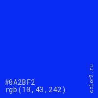 Цвет #0A2BF2 в цветовой модели RGB обозначается тремя октетами (10, 43, 242) в десятичном формате и #0A2BF2 в шестнадцатиричном (hex) формате, которые являются интенсивностью красного 10 (hex 0A), интенсивность зелёного 43 (hex 2B) и интенсивность синего 242 (hex F2).