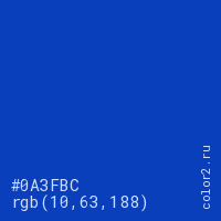 Цвет #0A3FBC в цветовой модели RGB обозначается тремя октетами (10, 63, 188) в десятичном формате и #0A3FBC в шестнадцатиричном (hex) формате, которые являются интенсивностью красного 10 (hex 0A), интенсивность зелёного 63 (hex 3F) и интенсивность синего 188 (hex BC).