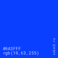 Цвет #0A3FFF в цветовой модели RGB обозначается тремя октетами (10, 63, 255) в десятичном формате и #0A3FFF в шестнадцатиричном (hex) формате, которые являются интенсивностью красного 10 (hex 0A), интенсивность зелёного 63 (hex 3F) и интенсивность синего 255 (hex FF).
