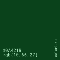 Цвет #0A421B в цветовой модели RGB обозначается тремя октетами (10, 66, 27) в десятичном формате и #0A421B в шестнадцатиричном (hex) формате, которые являются интенсивностью красного 10 (hex 0A), интенсивность зелёного 66 (hex 42) и интенсивность синего 27 (hex 1B).