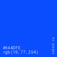 Цвет #0A4DFE в цветовой модели RGB обозначается тремя октетами (10, 77, 254) в десятичном формате и #0A4DFE в шестнадцатиричном (hex) формате, которые являются интенсивностью красного 10 (hex 0A), интенсивность зелёного 77 (hex 4D) и интенсивность синего 254 (hex FE).