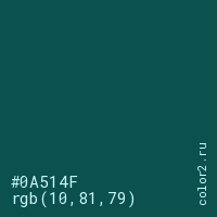 Цвет #0A514F в цветовой модели RGB обозначается тремя октетами (10, 81, 79) в десятичном формате и #0A514F в шестнадцатиричном (hex) формате, которые являются интенсивностью красного 10 (hex 0A), интенсивность зелёного 81 (hex 51) и интенсивность синего 79 (hex 4F).
