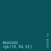 Цвет #0A545C в цветовой модели RGB обозначается тремя октетами (10, 84, 92) в десятичном формате и #0A545C в шестнадцатиричном (hex) формате, которые являются интенсивностью красного 10 (hex 0A), интенсивность зелёного 84 (hex 54) и интенсивность синего 92 (hex 5C).