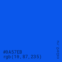 Цвет #0A57EB в цветовой модели RGB обозначается тремя октетами (10, 87, 235) в десятичном формате и #0A57EB в шестнадцатиричном (hex) формате, которые являются интенсивностью красного 10 (hex 0A), интенсивность зелёного 87 (hex 57) и интенсивность синего 235 (hex EB).