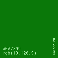 Цвет #0A7809 в цветовой модели RGB обозначается тремя октетами (10, 120, 9) в десятичном формате и #0A7809 в шестнадцатиричном (hex) формате, которые являются интенсивностью красного 10 (hex 0A), интенсивность зелёного 120 (hex 78) и интенсивность синего 9 (hex 09).