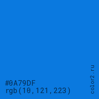 Цвет #0A79DF в цветовой модели RGB обозначается тремя октетами (10, 121, 223) в десятичном формате и #0A79DF в шестнадцатиричном (hex) формате, которые являются интенсивностью красного 10 (hex 0A), интенсивность зелёного 121 (hex 79) и интенсивность синего 223 (hex DF).