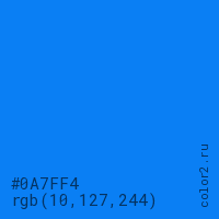 Цвет #0A7FF4 в цветовой модели RGB обозначается тремя октетами (10, 127, 244) в десятичном формате и #0A7FF4 в шестнадцатиричном (hex) формате, которые являются интенсивностью красного 10 (hex 0A), интенсивность зелёного 127 (hex 7F) и интенсивность синего 244 (hex F4).