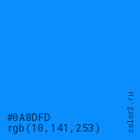 Цвет #0A8DFD в цветовой модели RGB обозначается тремя октетами (10, 141, 253) в десятичном формате и #0A8DFD в шестнадцатиричном (hex) формате, которые являются интенсивностью красного 10 (hex 0A), интенсивность зелёного 141 (hex 8D) и интенсивность синего 253 (hex FD).