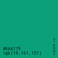 Цвет #0AA179 в цветовой модели RGB обозначается тремя октетами (10, 161, 121) в десятичном формате и #0AA179 в шестнадцатиричном (hex) формате, которые являются интенсивностью красного 10 (hex 0A), интенсивность зелёного 161 (hex A1) и интенсивность синего 121 (hex 79).