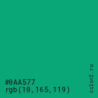 Цвет #0AA577 в цветовой модели RGB обозначается тремя октетами (10, 165, 119) в десятичном формате и #0AA577 в шестнадцатиричном (hex) формате, которые являются интенсивностью красного 10 (hex 0A), интенсивность зелёного 165 (hex A5) и интенсивность синего 119 (hex 77).
