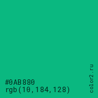 Цвет #0AB880 в цветовой модели RGB обозначается тремя октетами (10, 184, 128) в десятичном формате и #0AB880 в шестнадцатиричном (hex) формате, которые являются интенсивностью красного 10 (hex 0A), интенсивность зелёного 184 (hex B8) и интенсивность синего 128 (hex 80).