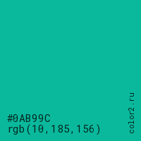 Цвет #0AB99C в цветовой модели RGB обозначается тремя октетами (10, 185, 156) в десятичном формате и #0AB99C в шестнадцатиричном (hex) формате, которые являются интенсивностью красного 10 (hex 0A), интенсивность зелёного 185 (hex B9) и интенсивность синего 156 (hex 9C).