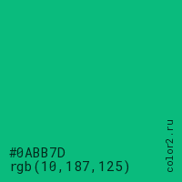 Цвет #0ABB7D в цветовой модели RGB обозначается тремя октетами (10, 187, 125) в десятичном формате и #0ABB7D в шестнадцатиричном (hex) формате, которые являются интенсивностью красного 10 (hex 0A), интенсивность зелёного 187 (hex BB) и интенсивность синего 125 (hex 7D).