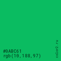Цвет #0ABC61 в цветовой модели RGB обозначается тремя октетами (10, 188, 97) в десятичном формате и #0ABC61 в шестнадцатиричном (hex) формате, которые являются интенсивностью красного 10 (hex 0A), интенсивность зелёного 188 (hex BC) и интенсивность синего 97 (hex 61).