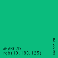 Цвет #0ABC7D в цветовой модели RGB обозначается тремя октетами (10, 188, 125) в десятичном формате и #0ABC7D в шестнадцатиричном (hex) формате, которые являются интенсивностью красного 10 (hex 0A), интенсивность зелёного 188 (hex BC) и интенсивность синего 125 (hex 7D).