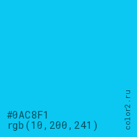 Цвет #0AC8F1 в цветовой модели RGB обозначается тремя октетами (10, 200, 241) в десятичном формате и #0AC8F1 в шестнадцатиричном (hex) формате, которые являются интенсивностью красного 10 (hex 0A), интенсивность зелёного 200 (hex C8) и интенсивность синего 241 (hex F1).