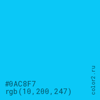 Цвет #0AC8F7 в цветовой модели RGB обозначается тремя октетами (10, 200, 247) в десятичном формате и #0AC8F7 в шестнадцатиричном (hex) формате, которые являются интенсивностью красного 10 (hex 0A), интенсивность зелёного 200 (hex C8) и интенсивность синего 247 (hex F7).