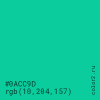 Цвет #0ACC9D в цветовой модели RGB обозначается тремя октетами (10, 204, 157) в десятичном формате и #0ACC9D в шестнадцатиричном (hex) формате, которые являются интенсивностью красного 10 (hex 0A), интенсивность зелёного 204 (hex CC) и интенсивность синего 157 (hex 9D).
