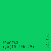 Цвет #0ACE63 в цветовой модели RGB обозначается тремя октетами (10, 206, 99) в десятичном формате и #0ACE63 в шестнадцатиричном (hex) формате, которые являются интенсивностью красного 10 (hex 0A), интенсивность зелёного 206 (hex CE) и интенсивность синего 99 (hex 63).