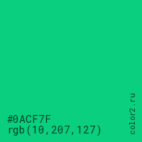 Цвет #0ACF7F в цветовой модели RGB обозначается тремя октетами (10, 207, 127) в десятичном формате и #0ACF7F в шестнадцатиричном (hex) формате, которые являются интенсивностью красного 10 (hex 0A), интенсивность зелёного 207 (hex CF) и интенсивность синего 127 (hex 7F).