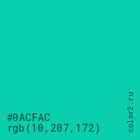 Цвет #0ACFAC в цветовой модели RGB обозначается тремя октетами (10, 207, 172) в десятичном формате и #0ACFAC в шестнадцатиричном (hex) формате, которые являются интенсивностью красного 10 (hex 0A), интенсивность зелёного 207 (hex CF) и интенсивность синего 172 (hex AC).