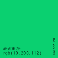 Цвет #0AD070 в цветовой модели RGB обозначается тремя октетами (10, 208, 112) в десятичном формате и #0AD070 в шестнадцатиричном (hex) формате, которые являются интенсивностью красного 10 (hex 0A), интенсивность зелёного 208 (hex D0) и интенсивность синего 112 (hex 70).