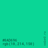Цвет #0AD696 в цветовой модели RGB обозначается тремя октетами (10, 214, 150) в десятичном формате и #0AD696 в шестнадцатиричном (hex) формате, которые являются интенсивностью красного 10 (hex 0A), интенсивность зелёного 214 (hex D6) и интенсивность синего 150 (hex 96).