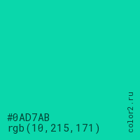 Цвет #0AD7AB в цветовой модели RGB обозначается тремя октетами (10, 215, 171) в десятичном формате и #0AD7AB в шестнадцатиричном (hex) формате, которые являются интенсивностью красного 10 (hex 0A), интенсивность зелёного 215 (hex D7) и интенсивность синего 171 (hex AB).