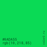 Цвет #0ADA55 в цветовой модели RGB обозначается тремя октетами (10, 218, 85) в десятичном формате и #0ADA55 в шестнадцатиричном (hex) формате, которые являются интенсивностью красного 10 (hex 0A), интенсивность зелёного 218 (hex DA) и интенсивность синего 85 (hex 55).