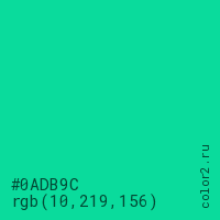 Цвет #0ADB9C в цветовой модели RGB обозначается тремя октетами (10, 219, 156) в десятичном формате и #0ADB9C в шестнадцатиричном (hex) формате, которые являются интенсивностью красного 10 (hex 0A), интенсивность зелёного 219 (hex DB) и интенсивность синего 156 (hex 9C).