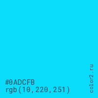 Цвет #0ADCFB в цветовой модели RGB обозначается тремя октетами (10, 220, 251) в десятичном формате и #0ADCFB в шестнадцатиричном (hex) формате, которые являются интенсивностью красного 10 (hex 0A), интенсивность зелёного 220 (hex DC) и интенсивность синего 251 (hex FB).