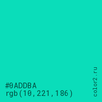 Цвет #0ADDBA в цветовой модели RGB обозначается тремя октетами (10, 221, 186) в десятичном формате и #0ADDBA в шестнадцатиричном (hex) формате, которые являются интенсивностью красного 10 (hex 0A), интенсивность зелёного 221 (hex DD) и интенсивность синего 186 (hex BA).