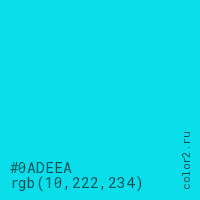 Цвет #0ADEEA в цветовой модели RGB обозначается тремя октетами (10, 222, 234) в десятичном формате и #0ADEEA в шестнадцатиричном (hex) формате, которые являются интенсивностью красного 10 (hex 0A), интенсивность зелёного 222 (hex DE) и интенсивность синего 234 (hex EA).