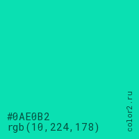 Цвет #0AE0B2 в цветовой модели RGB обозначается тремя октетами (10, 224, 178) в десятичном формате и #0AE0B2 в шестнадцатиричном (hex) формате, которые являются интенсивностью красного 10 (hex 0A), интенсивность зелёного 224 (hex E0) и интенсивность синего 178 (hex B2).
