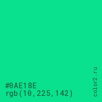 Цвет #0AE18E в цветовой модели RGB обозначается тремя октетами (10, 225, 142) в десятичном формате и #0AE18E в шестнадцатиричном (hex) формате, которые являются интенсивностью красного 10 (hex 0A), интенсивность зелёного 225 (hex E1) и интенсивность синего 142 (hex 8E).