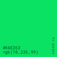 Цвет #0AE263 в цветовой модели RGB обозначается тремя октетами (10, 226, 99) в десятичном формате и #0AE263 в шестнадцатиричном (hex) формате, которые являются интенсивностью красного 10 (hex 0A), интенсивность зелёного 226 (hex E2) и интенсивность синего 99 (hex 63).