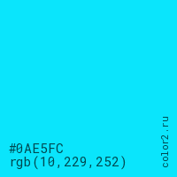 Цвет #0AE5FC в цветовой модели RGB обозначается тремя октетами (10, 229, 252) в десятичном формате и #0AE5FC в шестнадцатиричном (hex) формате, которые являются интенсивностью красного 10 (hex 0A), интенсивность зелёного 229 (hex E5) и интенсивность синего 252 (hex FC).