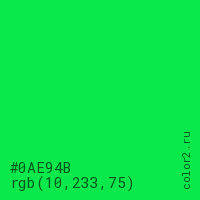 Цвет #0AE94B в цветовой модели RGB обозначается тремя октетами (10, 233, 75) в десятичном формате и #0AE94B в шестнадцатиричном (hex) формате, которые являются интенсивностью красного 10 (hex 0A), интенсивность зелёного 233 (hex E9) и интенсивность синего 75 (hex 4B).