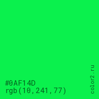 Цвет #0AF14D в цветовой модели RGB обозначается тремя октетами (10, 241, 77) в десятичном формате и #0AF14D в шестнадцатиричном (hex) формате, которые являются интенсивностью красного 10 (hex 0A), интенсивность зелёного 241 (hex F1) и интенсивность синего 77 (hex 4D).