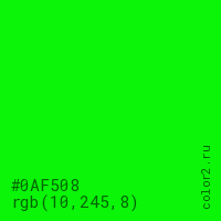 Цвет #0AF508 в цветовой модели RGB обозначается тремя октетами (10, 245, 8) в десятичном формате и #0AF508 в шестнадцатиричном (hex) формате, которые являются интенсивностью красного 10 (hex 0A), интенсивность зелёного 245 (hex F5) и интенсивность синего 8 (hex 08).