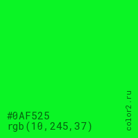 Цвет #0AF525 в цветовой модели RGB обозначается тремя октетами (10, 245, 37) в десятичном формате и #0AF525 в шестнадцатиричном (hex) формате, которые являются интенсивностью красного 10 (hex 0A), интенсивность зелёного 245 (hex F5) и интенсивность синего 37 (hex 25).